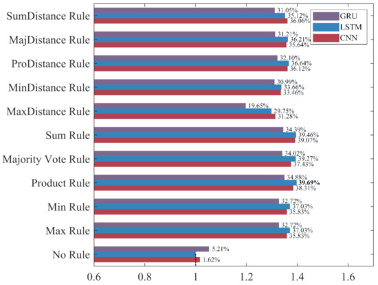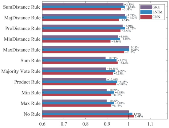 To intuitively compare the influence of different ensemble rules on the recognition performance under different evaluation metrics, the classifier built without ensemble learning, which has the worst performance in each evaluation metric, is used as the benchmark “1” to calculate the increase rate and decrease rate of the evaluation metrics for ensemble classifiers. The results are shown in Figure 15, Figure 16, Figure 17 and Figure 18.