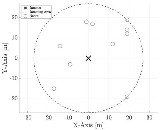 Let us consider a playground constituted of a set of randomly deployed sensing nodes , where N spans between 3 (minimum number of sensors to perform localization) and 10. Moreover, we assume the presence of a jammer at coordinates (center of the scene). Figure 1 shows typical deployment in an area of m. The jamming power is reset at each simulation-run to fit the node deployment, thus covering all the communication links. In particular, we assume that the jammer is deployed at the center of the scene without being aware of the actual position of the nodes. However, before starting the jamming activity, it eavesdrops the radio spectrum to infer the relative position of the furthest node, thus subsequently adapting its jamming power.