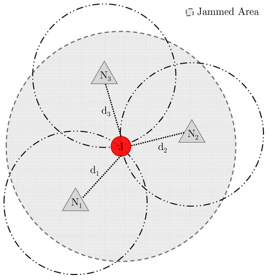 Jamming is a malicious radio activity carried out with the purpose of disrupting wireless communications. Jamming can be considered a physical-layer denial-of-service attack, where the adversary intentionally prevents one or more wireless communications by affecting the capability of the receiver(s) to correctly detect and receive a transmitted message [1]. Deploying jamming is extremely easy and cost-effective. Indeed, cost-effective software-defined radios (SDRs) make the design and implementation of a jammer straightforward, are able to eavesdrop on the radio spectrum, identify the target frequency to be jammed and finally, transmit a disrupting signal that prevents the receiver discriminating the purported one. Although jamming can be used by network nodes to exclusively guarantee wireless communications capabilities to a specific set of (ally) devices, the most practical and dangerous purpose of jamming is to completely disrupt the communications in a target area. Typical examples of critical targets are airports, sensitive infrastructures, or tactical military scenarios [2]. Jamming mainly involves three research areas: (i) detection; (ii) localization; and (iii) mitigation [3,4]. A jammer, by definition, is exposed—in order to disrupt the communications, it has to transmit; therefore, the jammer has to deploy smart techniques to avoid detection and localization. Common techniques for going undetected imply shaping the jamming signal in a way to make it indistinguishable from “normal” interference. Moreover, as per the vast majority of denial-of-service techniques, jamming cannot be completely prevented. Indeed, jamming mitigation involves the combination of different techniques to evade the jamming signal [5,6], thus enabling the receiver (and the transmitter) to work in a clear portion of the spectrum. Finally, jammer localization techniques resort to the estimation of the received signal strength (RSS) to infer the distance to the jammer (ranging) [7]. When multiple collaborating sources perform such a ranging technique, the position of the transmitter (jammer) can be precisely estimated.