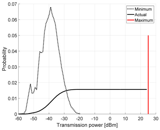 Classical jamming localization problems assume a jammer that keeps transmitting over time with the same power—this one being chosen to disrupt all communications in the area. We refer to such a behavior as constant-power jammer. Although the jammer can implement different strategies to stay as stealthy as possible, it cannot reduce the transmitting power under a certain threshold, i.e., the power to cover the whole playground. Therefore, the only significant source of uncertainty to jammer localization comes from the shadowing effect, i.e., the random variable from Equation (1). As will be subsequently clarified (as well as in related works), this can be mitigated by increasing both the number of sensing nodes and the readings of the received signal strength at each node. Our intuition to make jammer localization more difficult is to adopt a power-modulated jammer that randomly changes its transmission power as a function of time t. The jamming power is uniformly chosen in the interval . As previously discussed for the constant-power jammer, is chosen in order to cover the whole playground, while dBm. The maximum transmission power can be chosen as a function of different factors. As will become clear in the following, increasing makes the jammer’s position more difficult to estimate; nevertheless, this significantly affects the jammer’s energy budget. Figure 3 shows the transmission power strategy implemented by the jammers. The constant-power jammer sets the transmission power to the strict minimum (dotted line in Figure 3) necessary that allows the full coverage of the playground. Indeed, given the random deployment experienced in every simulation run, the minimum transmission power varies between and dBm. Conversely, the power-modulated jammer chooses the minimum transmission power in the same way as the constant jammer, but it also set a maximum transmission power as depicted by the solid red line in Figure 3 being equal to 25 dBm. Finally, the actual transmission power is randomly chosen from the current minimum and the maximum as depicted by the solid black line in Figure 3.