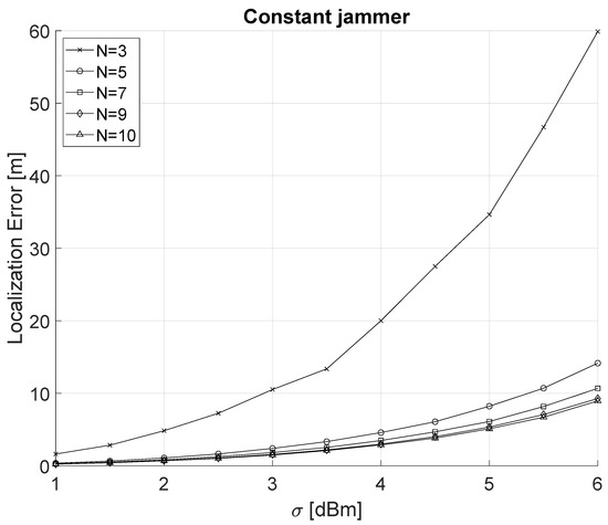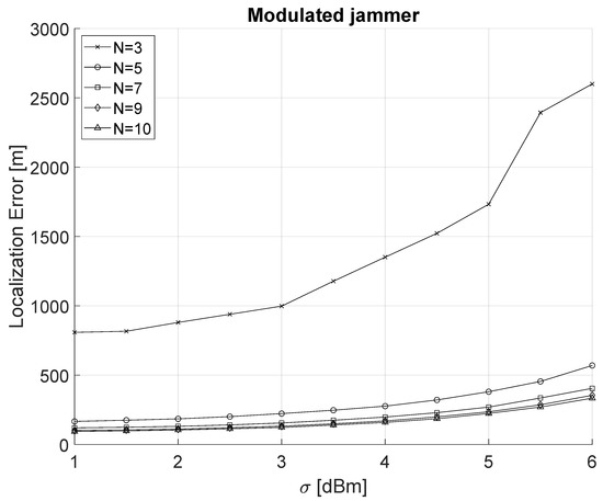 In this section, we compare the previously introduced localization algorithm (LLS) against both a constant and a power-modulated jammer. We start our analysis from the constant-modulated jammer considering the shadowing effect with a variance in the range (1 dBm 6 dBm) and a number N of deployed sensors (). Figure 4 shows the localization error as a function of and N for the case of a constant jammer. The localization error was computed as the Euclidean distance between the actual and estimated jammer position. Finally, our results take into account the average value of 5000 simulation runs and an average of 100 jamming signal readings.