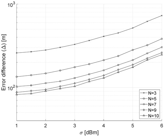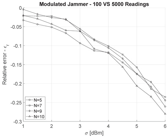 We now consider the difference between the localization error of the modulated and the constant-power jammer. Figure 6 shows as a function of 1 dBm 6 dBm and . As previously observed, the number of nodes mitigates the uncertainty associated with the jammer position, i.e., when dBm, varies between approximately 328 m () and approximately 112 m (). Moreover, we observe how the combined effect of and the modulated power can significantly hinder the localization; indeed, the case and dBm has approximately the same performance as and dBm. Finally, we observe how even under conservative assumptions for , i.e., dBm, increasing the number of nodes does not significantly affect the localization performance, i.e., the error difference does not significantly increase when moving from to . Lastly, we consider the number of readings of the jamming signal. As previously discussed, we considered 100 readings for all the performance. In the following, we consider 5000 readings, and we estimate the relative error for the modulated jammer as follows:
