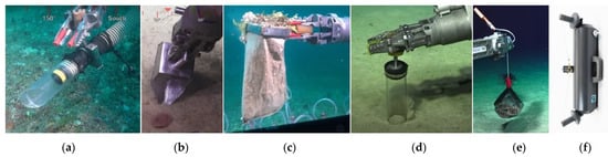 ROV collection tools: (a) suction sampler; (b) scoop; (c) scoop net; (d) corer; (e) trap; (f) Niskin bottle. ((a–e) Reprinted with permission from ref. [23,24,25,26,27]. © 2022–2021 Schmidt Ocean Institute. (f) Reprinted with permission from ref. [28]. © 2022-2022 General Oceanics).
