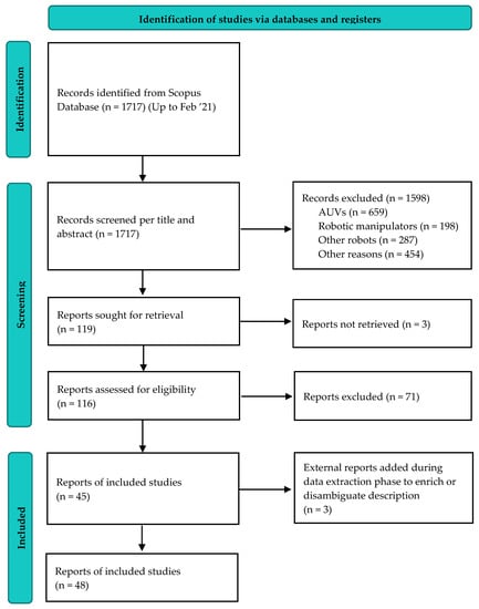 The whole selection procedure is illustrated in Figure 4. The search resulted in a total of 1717 articles. A total of 1645 articles were excluded after title and abstracts screening: 659 were related to autonomous underwater vehicles (AUVs) navigation, control, sensors, localization or object recognition underwater, 198 to robotic manipulators, 287 to other types of robots, 54 to other sea related topics (navigation, diving or fishing), 75 to pure sciences (oceanography, biology, chemistry, etc.), and 325 were excluded for other reasons (e.g., because they were related to education in engineering and marine sciences, etc.).