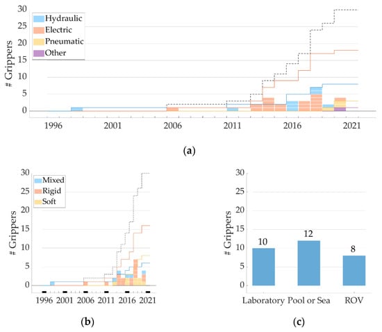 For the 30 grippers identified in this review: (a) Number of new grippers per year (1996–2021), grouped by color per type of actuation selected. Solid lines represent the cumulative number of grippers for a given type of actuation over the years. The black dashed line represents the cumulative number of grippers over time. (b) Number of new grippers per year, grouped by color per selected technology among mixed, soft, or rigid. Solid lines represent the cumulative number of grippers for a given type of technology over the years. The black dashed line represents the cumulative number of grippers over time. (c) Number of grippers tested in each environment: tank in a research laboratory, pool or sea, and mounted on a ROV.