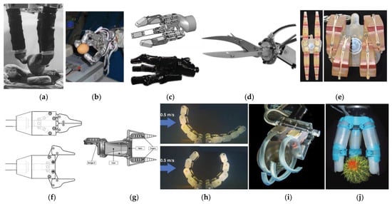 Underwater gripper tested in lab tank: (a) AMADEUS; (b) HEU II; (c) SeeGrip; (d) Okinawa; (e) Stanford; (f) Malaysia Pahang; (g) Calabria; (h) Tokai; (i) Wyss Ultragentle; (j) VSPP-3. ((a) Reprinted with permission from ref. [31]. © 2022 Emerald Publishing Limited, all rights reserved. (b,e,f,h) Reprinted with permission from ref. [37,42,46,49]. © 2022-2020 IEEE. (c) Reprinted with permission from ref. [38,51]. © 2022 IEEE and © 2022 DFKI. (d) Reprinted from ref. [41], CC-BY license. © 2022 Fuji technology press. (g) Reprinted with permission from ref. [47]. © 2022 Elsevier. (i) Reprinted with permission from ref. [18]. © 2022 AAAS. (j) Reprinted with permission from ref. [50]. © 2022 Liebert Pub.).