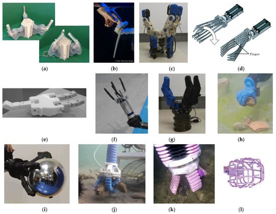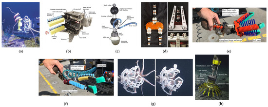 University of Calabria developed an underwater manipulator [47] implementing also a gripper (Figure 6g) with interchangeable palm that enables switching between 2- or 4-fingered configuration. It has an actuator for wrist rotation and one for closing the gripper, and the closing mechanism consists of the first phalange stopping as soon as an object is encountered, while the second phalange wraps around it.