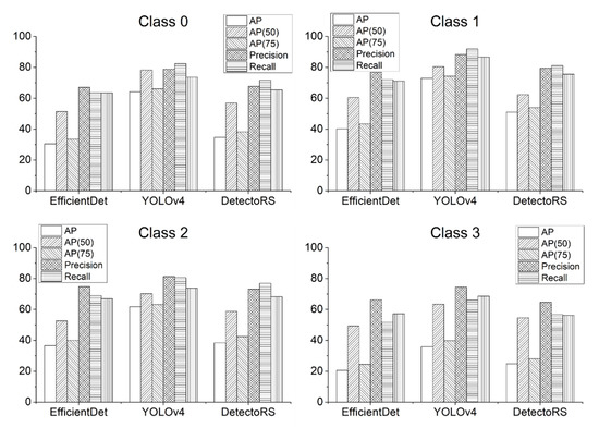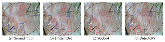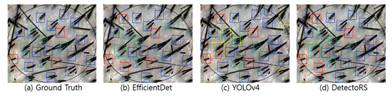 Experimental results showed that YOLOv4 exhibited the highest detection performance among the three detection models, with a mAP of 58.67, while EfficientDet and DetectoRS showed mAPs of 31.97 and 37.22, respectively (see Table 3). While all three models detected similar areas, inaccurate classification results led to differences in performance. In addition, YOLOv4 had a lower rate of redundant detection.