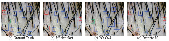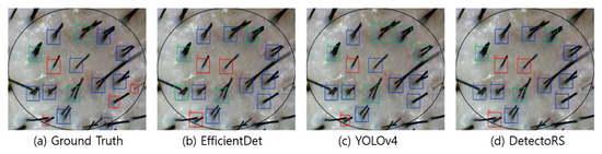 As shown in Figure 6, in cases with many strands of white hair or few strands of hair, the detection performance of all three models was degraded compared to other cases. As for the low detection performance for white hair, the white hair strands may have been considered a foreign substance present in the scalp, resulting in a failure in the classification of hair follicles. YOLOv4 detected empty follicles accurately, whereas both EfficientDet and DetectoRS classified empty follicles as Class 1. Furthermore, when both white and black hair strands were present in the same follicle, neither EfficientDet nor DetectoRS detected such a follicle successfully.