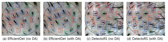 The performance boosts by the data augmentation were clearly visible in the case of EfficientDet and DetectoRS, whereas in YOLOv4, there was no significant difference in performance as a result of applying data augmentation. This result appears to have been caused by the Mosaic data augmentation employed by YOLOv4. The Mosaic data augmentation combines four training images into a synthetic image, allowing the model to learn how to detect small objects. According to the visualization results, EfficientDet showed an improvement in the classification of Class 1 and Class 2 with data augmentation, whereas the redundant detection of the same hair follicles was reduced for DetectoRS (see Figure 8).