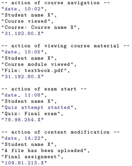 Each student’s action consists of a set of data. General data, independent of the distance education system used, are shown in Figure 1. Such data commonly include date and time, student’s name, action name, action content, and student’s device (public) IP address. General actions covered in Figure 1 are (i) viewing the course landing web page, (ii) viewing a particular course material (pdf document), (iii) start of an exam in a form of a quiz (final exam), and (iv) file upload, which may be a photocopied hand-written text with the exam elaboration. The distance education systems provide the student’s actions in different formats and via different interfaces (e.g., web interface and REST API). Custom parsing may be needed to extract the relevant content, such as timestamps, IP addresses, and action names.