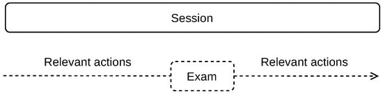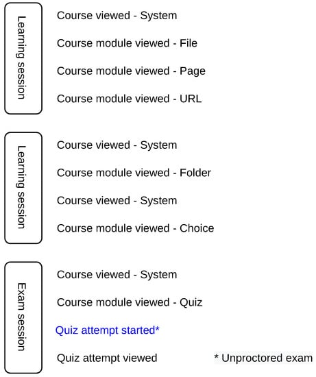 After the sessions are delimited, we identify the exam and learning sessions. Exam session is the one that contains a general exam start action (e.g., ‘Quiz attempt started’), which is independent of the course, exam name and exam setup (structure of the exam), as shown in Figure 4. For automated processing, the general action for exam start is derived from the distance education system used, which is shared across all courses in the education system. Other sessions are referred to as learning sessions.