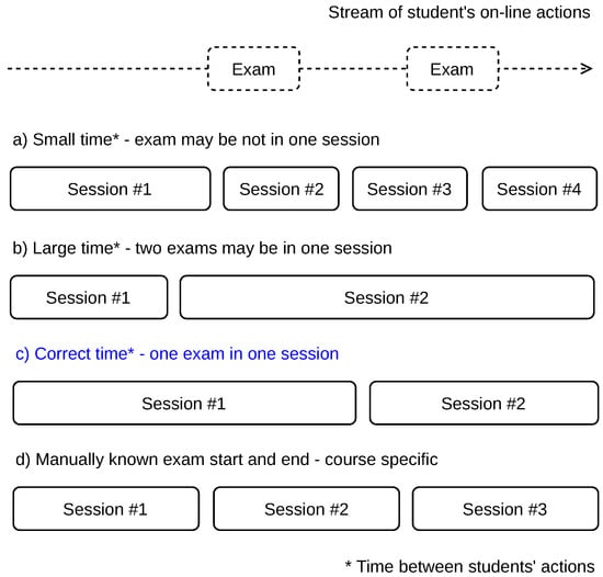 - Scenario (d): The sessions are delimited by specific actions, which are manually found. For example, if the exam name is known, such as ‘Final exam—Course name X’ and the exam name is recorded along with the action name, which is ‘Attempt started’, such an action can be used to indicate the exam start. This, however, requires knowledge of the exam names, which is specific for each course. Moreover, it requires a manual inspection of all actions before and after the exam to find all relevant information. This scenario is therefore not suitable for automated processing.
