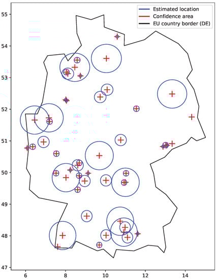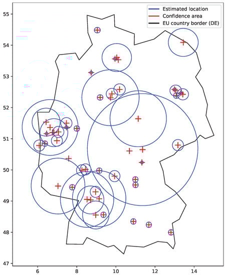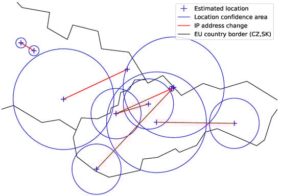 Figure 5 shows a sample of location confidence areas as circles that we observed for IP addresses of the RIPE Atlas [26]. The observed confidence areas were circles with radii of 1, 5, 10, 20, 50, 100, 200, 500, and 1000 km, which were obtained from the MaxMind GeoLite2 City database [27]. Different values may be observed for different location database providers. Typically, large confidence areas were returned for locations pointing to the country capital cities and country geographical centers, as these locations are used if there is not a better result available (stored in the geolocation database). However, many other returned locations also had a large confidence area. Smaller areas are used for the results where the returned location can be trusted, such those previously obtained via GPS or WiFi positions. The same locations and confidence areas may be shared by a range of addresses, defined by their network mask.