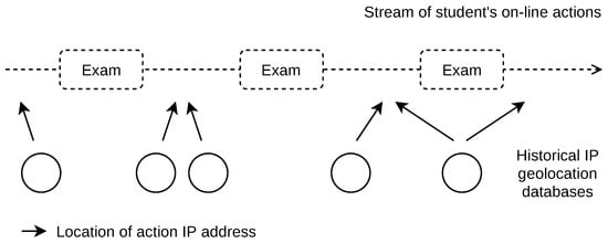 The student’s on-line actions include the public IP address of the student’s device. We obtain the geographic location of the IP addresses. IP geolocation is commonly used by various Internet services and applications [19,20]. The location can be derived by looking up an IP geolocation database [21] or by active network measurements (typically latency) [22]. The active measurement delays the location process and cannot be used for large data processing, as we use in our method. We, therefore, customize the database-based approach for our cheating indication purpose.