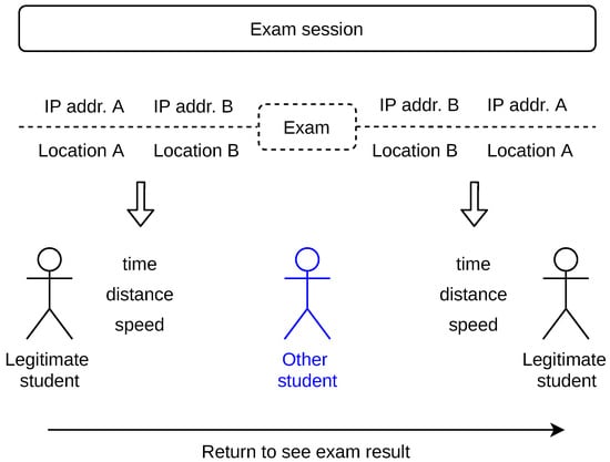 We calculate the student’s speed of travel during the exam sessions, as shown in Figure 8. The speed is calculated on the occasion when the IP address changes between two subsequent actions. We further refer to these occasions as ‘indication events’. An indication event presumes that the students possibly changed roles, that is, the other student now acts as the legitimate or vice versa. Such possibility is further elaborated in Section 3.4. The indication events may occur (i) before exam, (ii) after exam, or (iii) both before and after exam. The latter may happen when the legitimate student is curious to know the result of the exam taken by the other student, immediately after the exam ends. In Figure 8, we refer to this scenario as ‘Return to see exam result’. Multiple indication events during an exam session are also possible when the legitimate and the other student work in the education system simultaneously.