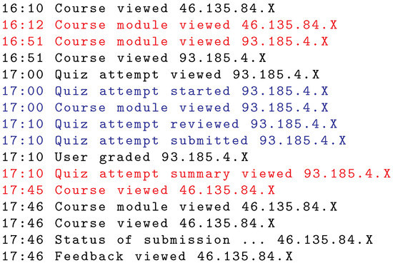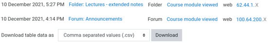 The student’s data come from the courses that were taught during the COVID-19 pandemic, when the university was closed for attendance education. It was up to the course leaders to choose the form of on-line examinations, such as unproctored, proctored with a mandatory web camera showing the student face, or oral examination over a video session. We worked with the data of the students enrolled in selected courses, where the on-line exams were unproctored. For comparison reasons, we also included courses with on-line unproctored exams that were taught before and after the university was closed for attendance education, i.e., unproctored on-line examination was a regular part of the courses. We exported all students’ actions for each course. The export was done from the Moodle distance education system via the web interface [28], which is in a modified form shown in Figure 10. Actions with unusable data, such as carrier-grade NAT IP addresses, were excluded.
