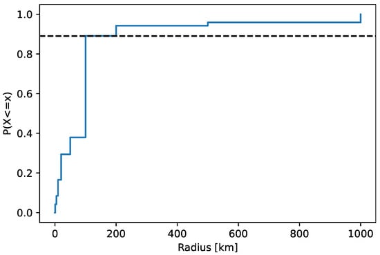 Cumulative distribution function of IP address confidence location area radius in indication events.