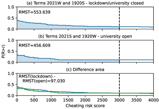 Figure 16 compares student cheating risk scores in courses taught in four academic terms. Two of the terms, the winter term of 2020/2021 and the summer term of 2019/2020, were affected by the country lockdown due to COVID-19 pandemic. The university was closed for attendance education and all exams were distant, including unproctored on-line exams in the form of a quiz. Two other terms, summer 2020/2021 and winter 2019/2020, were unaffected and the students attended the classes. The courses in these terms had unproctored on-line exams on a regular basis, that is, independent of the lockdown. The difference in the delimited area between the survival curves was calculated by [29] and was ~97, indicating that the students in question cheated more in the terms affected by the COVID-19 pandemic, but the difference was not significant.