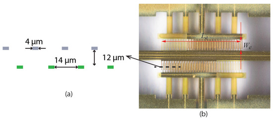 Schematic cross section (a) and close up photograph (b) of a capacitive readout structure. Two capacitors, one at each side of the channel, are formed by interdigitated combs. The combs shown in gray in the cross section are attached to the vibrating channel while the combs shown in green are attached to the silicon substrate. , .