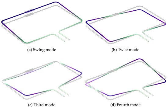 The suspended channel can be actuated into different resonant modes, as shown in Figure 3. In this paper, the channels are actuated by piezoelectric actuators as presented in [22]. The modes shown in Figure 3a,b are used for Coriolis mass flow sensing. In the case of swing mode actuation, the Coriolis mode is the twist mode, and vice versa. The Coriolis mode is actuated by the Coriolis forces generated by the fluid flowing inside the channel. The mass flow is measured by measuring the ratio between the amplitudes of the actuation mode and Coriolis mode [2].