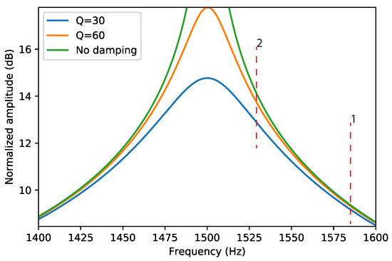 Typical frequency response of a harmonic oscillator which represents the Coriolis mode close to the resonance frequency and at different values of the quality factors. In this example, the resonance frequency is set to 1500 . The two red dashed lines indicate possible values of the resonance frequency of the actuation mode. In situation 2, the sensitivity is higher, however at the expense of an increased dependence on the value of the quality factor.