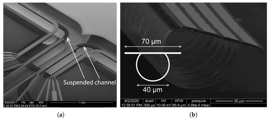 (a) SEM image of the suspended channel in a micro-Coriolis mass flow sensor, and (b) a cross sectional image of the channel with a schematic drawing showing the dimensions of the cross section.