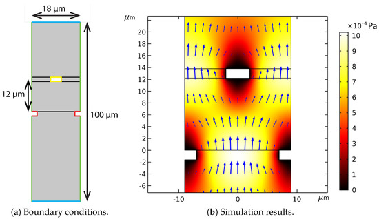 The domain of the 2D simulation (a) and the simulation result (b) of flow around the capacitive readout fingers. The gray area in (a) is the domain where fluid flow was simulated. The green lines indicate a symmetrical boundary condition. The blue lines indicate an open boundary condition. The red and yellow lines represent no-slip walls. The yellow rectangle represents a moving finger. The red lines represent the fixed fingers. The black lines separate the different domains of the moving mesh. The simulation results (b) show the flow and pressure when the moving finger has moved to the highest point and the velocity is zero. The color legend in (b) indicates the pressure. The blue arrows represent the flow velocity.