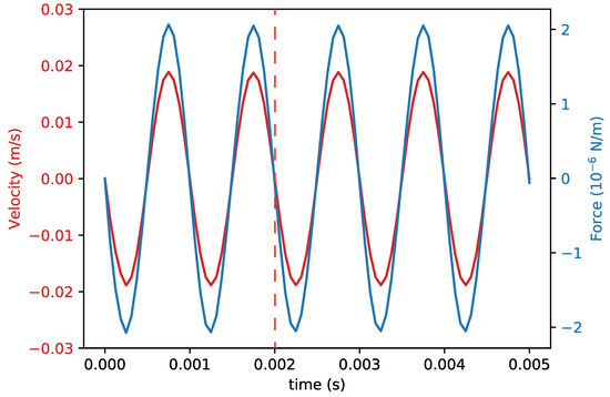 Figure 7 shows the velocity of the finger and the resulting drag force as a function of time from the creeping flow physical model, which is very similar to the result from the laminar flow physical model. This is as expected because the Reynolds number is very small. The vibration frequency and amplitude were set to 2 and , respectively. There is only a small delay between the velocity and the force, indicating that the component in Equation (5) is relatively small. The coefficients were extracted by fitting the force curve with a sinusoidal function. The time dependent simulation was started with the initial condition that both the fluid and the finger are at rest. Therefore, the first two oscillation periods were not used in the calculation of the coefficients.