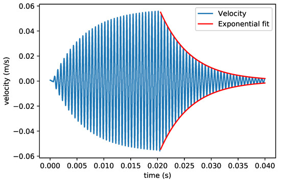 Measured velocity of the vibrating channel and exponential fit of the ring down process. This particular measurement was performed with the device from Figure 1d in the swing mode. The actuation voltage was applied at 0 and stopped after .