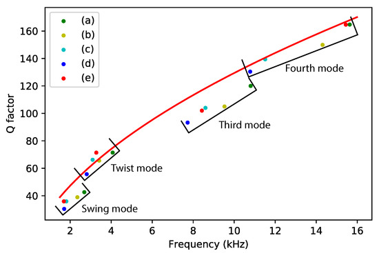 Table 3 shows a summary of the measured Q factors for different devices at different vibration modes. Figure 11 shows a plot of the measured Q factors as a function of resonance frequency together with the prediction from Equation (24).
