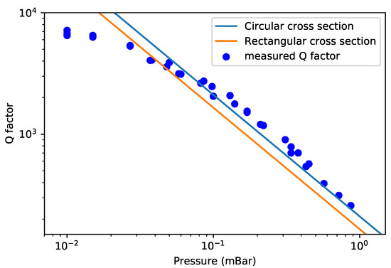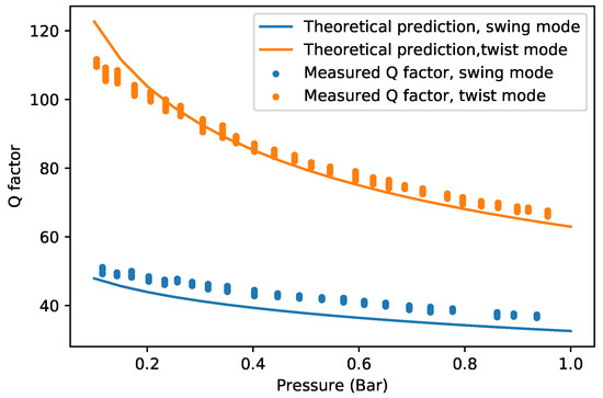 Figure 13 shows the measured Q factors together with the theoretically predicted Q factors based on Equation (25). The measurement was performed in a pressure range from to . The resulting Q factor ranges from 7155 to 258.