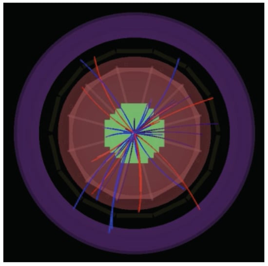 where p stands for the momentum, is the velocity of a particle with respect to the speed of light, L is the length of the particle’s track, T is the measured time of flight, and c is the speed of light. During the experiment, three parameters have to be measured: the length of its track (examples of the tracks are shown in Figure 2), momentum (both measured by TPC detector), and time of flight from interaction point to the ToF detector.