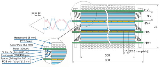 To register particles flying through the ToF detector, multigap resistive plate chambers (MRPC) are used. They are shown in Figure 3. There are ten of them in each ToF module. The MRPC consists of a stack of plates separated from each other by separators of equal size to form gas gaps. On the outer surface, there is a high-voltage coating that generates an electric field. As the particles pass through the detector, they ionize the gas inside. The flow of electrons and ions generates the voltage on the inner plates through the gas gap [44]. It is recorded as an impulse transferred to the second chamber which is the pre-amplifier chamber. The recorded signal combined with the knowledge of the collision moment observed in the FD detector allows determination of the particle time of flight [45].