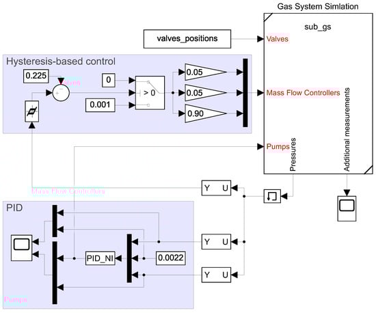 The basic control structure for the gas system is presented in Figure 7. This structure corresponds to the structure already used in the test pilot gas system. It includes a hysteresis-based control for the mixer subsystem and a PID controller to control the pump efficiency that utilizes the same parameters as the pilot system. The PID algorithm is compliant with an implementation from the National Instruments controller being used in the pilot system.
