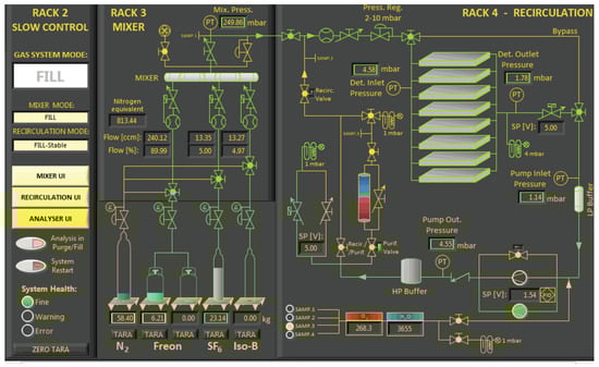 Similarly to the rest of the system, the mixer can operate in three main modes: purge, fill, run, and manual (direct). In the purge mode, the HV-1104, HV-1204, and HV-1304 three-way valves are set to allow nitrogen to flow through all lines. In the fill and run modes, they are put through the target gas mixture. In purge and fill modes, the control aims at keeping an overpressure of 250 mbar inside the output tank of the mixer (3.8 L capacity) and stable proportions of the gas mixture, trying to keep the gas flowing through the mass flow controllers. A proportional-integral-derivative controller (PID) control loop is used to maintain the pressure setpoint. The PID controller calculates the required total gas flow to maintain the set pressure value. In this mode, the impact of potential disturbances is negligible, except in critical cases when someone deliberately opens the mixer tank, or the gas in the cylinder runs out. Moreover, the pumps may force a flow greater than the mixer module can deliver. Then, the overpressure in the mixer tank drops to about 10 mbar, despite the maximum opening of the mass flow controllers [52]. In the run mode, where the closed recirculation circuit is activated, the mixer ought to work continuously, maintaining the flow: