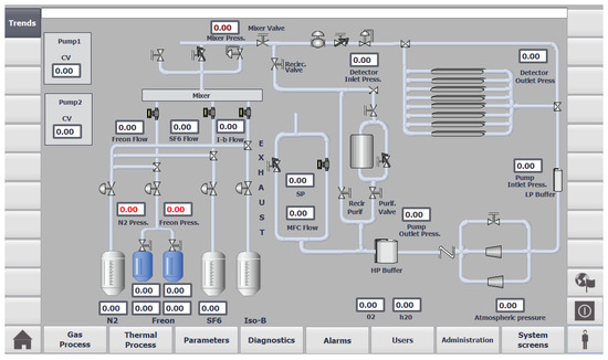 The designed target form of the gas system will be larger. Its structure in the form of a P&ID drawing is shown in Figure A1. The detector itself will be divided into four sectors with added solenoid valves, which will allow the remote shutdown of a given sector once a leakage is detected. The basis for leak detection of the detector’s chambers will be mass flow meters at the input and output of each of the 28 chambers. Each sector will also be equipped with a pressure transmitter.