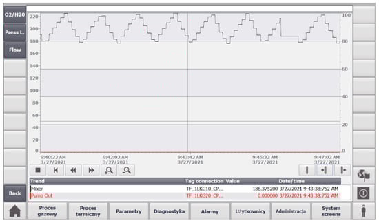 An attempt has been made to take those requirements into account with the digital twin GS system. A virtual PLC has been deployed by using Siemens PLCSIM Advanced software. The PLC is able to communicate with the simulated GS via an OPC server. A WinCC SCADA system has also been developed with a simple database contacting data about important signals in the system and basic HMI. One of the SCADA screens is presented in Figure 9. This screen shows values of various flow and pressure measurements of the gas system operation. Users can also send control values to pumps and valves in the GS. If the current value of a specific variable is above or below a certain threshold, then the numeric value is highlighted in red.