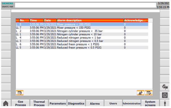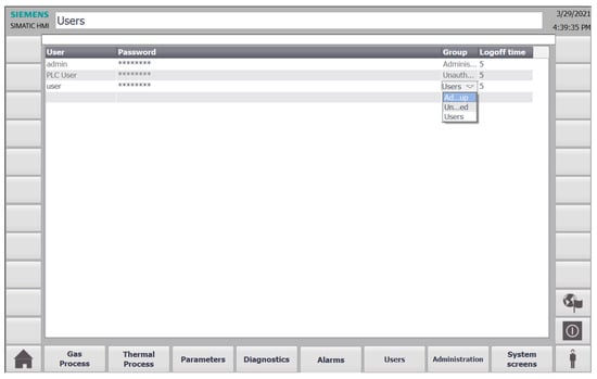 There are several buttons on the bottom of the screen shown in Figure 9 which can be used to navigate through the HMI screens and experience the full functionality of the SCADA system, such as viewing detailed information about alarms, users, and diagnostics. In the left corner of the diagnostics screen, there is also a button that can be used to show the user historical and current values of specific variables graphically in the form of trends, as shown in Figure 10. In addition, at the bottom on the right-hand side, there is a button for the user to enter their credentials to restrict access for specific parts of the system, as depicted in Figure 11. It allows to differentiate whether the user can clear system alarms, or only acknowledge them; an example alarm screen is shown in Figure 12.