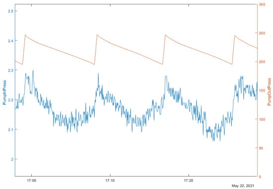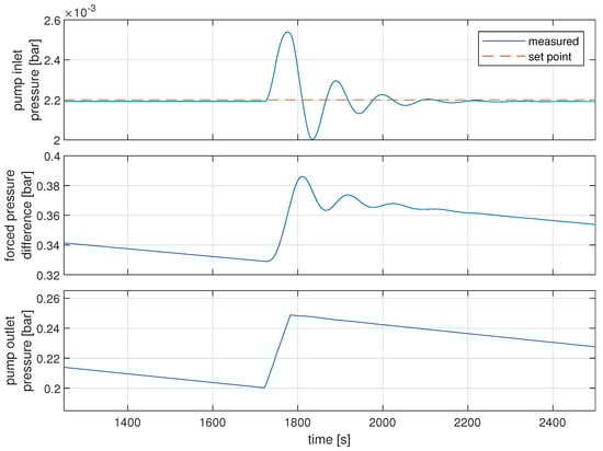 To verify and tune the simulated system, an experiment on the pilot version of GS was performed. A significant leak was introduced to the GS while measuring the response of the pump’s controller. Thus, inlet pressure and outlet pressure of the pump were measured (see Figure 13), in which the leakage causes the pump’s outlet pressure to drop constantly, to the point where the mixer controller activates and introduces a fresh portion of gas, increasing outlet pressure of the pump. This also influences the inlet pressure, as shown in Figure 13.