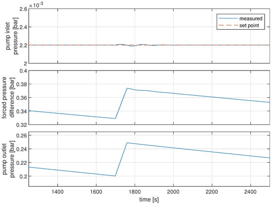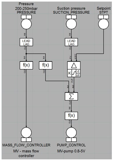 As is visible in Figure 13, the expected scenario is that pump outlet pressure should be in the range of 200 mbar to 250 mbar, while pump inlet pressure should oscillate around mbar. Compared to the results from simulation shown in Figure 16, it is visible that the desired range of controlled signal doubled in the simulated environment. Nevertheless, this level of precision is fully satisfying for further research and work on the control structure. It will also be the subject of further fine-tuning in the later stage of the research. The reference control structure used in the pilot gas system, used to control pump inlet pressure with the efficiency of the pump, was designed to be a simple PI controller with parameters of gain equal to −0.5 and integral constant equal to 0.15.