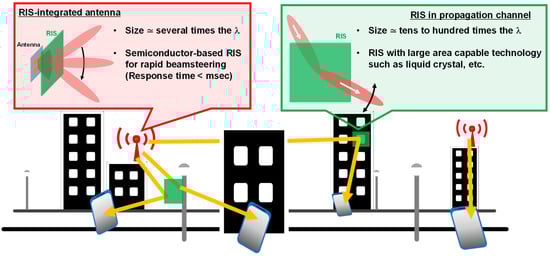 The unique behavior of metamaterials was also used for wireless communication applications [,,,]. In the 5th and 6th generation mobile communication systems (5G and 6G), in which frequencies higher than the millimeter waves are used, radio signals are easily shielded by objects such as buildings, trees, and so on. To resolve this issue, reconfigurable intelligent surfaces (RISs) have been investigated since 2019 [,,], in which metasurface/metamaterial technology is commonly used to design and control a two-dimensional distribution of the scattering characteristics. From the aspect of the wave propagation, the length of one side of the RIS is required to be greater than the radius of the first Fresnel zone to efficiently use scattered waves [,]. The radius of the first Fresnel zone depends on the relative position between the RIS and transmitters/receivers, which implies that the optimal metamaterial dynamization method should vary depending on whether the RIS is used integrally with the antenna or in a propagation environment away from the antenna (Figure 1). When the RIS is used in conjunction with antennas, the required size should be several times the wavelength, and the beam produced by the RIS-integrated antenna itself must search for the terminal, so a semiconductor-based dynamization method that can operate at high speed would be suitable. On the other hand, when the RIS is used in a propagation environment, the required size becomes tens to hundreds of times larger than the wavelength, so dynamization methods such as liquid crystals, which allow large-area fabrication, are considered to be more suitable. In this case, the response time should be of the order of milliseconds, so it is necessary to consider a system that does not require the beam formed by the RIS itself to search for the terminal position.