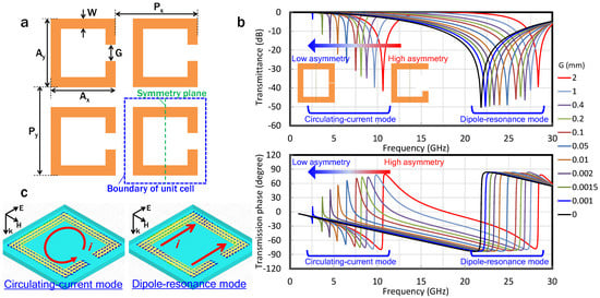 Figure 2 shows the results of the simulation of an infinite array of C-shaped SRR unit cells. The dimensions of the SRRs, as well as the symmetry plane of the circulating-current path, are shown in Figure 2a, where Ax, Ay, Px, Py, and W are 4, 4, 5, 5, and 0.5 mm, respectively, and the gap, G, is varied from 0 to 2 mm. From the transmission characteristics, two kinds of resonance modes can be observed, i.e., circulating-current and dipole-resonance modes (Figure 2b). The simulated surface current density distributions for each mode are shown in Figure 2c. Circulating current is induced at the lower frequency resonance mode (circulating-current mode), whereas at the higher frequency resonance mode (dipole resonance), current travels in the same direction in the arm with the gap and in the opposite arm []. The circulating-current eigenmode in the SRRs is excited by the asymmetry of SRR, with a reference to the electric-field plane of the incident wave, and this asymmetry is produced by the gaps in the SRRs. As the gap becomes smaller, the circulating-current path becomes more symmetrical, which induces the change in the peak intensity of the eigenmode. On the other hand, the dipole-resonance mode is mainly based on the size of the SRR and distance to the neighboring SRR in the direction parallel to the electric field, showing electric-field concentration between the neighboring SRR, not in the gap area. Therefore, the peak intensity of the dipole-resonance mode is almost constant regardless of the size of the gap, whereas the peak intensity of the circulating-current mode decreases as the gap becomes smaller. Similar to the intensity change, an abrupt change in the Lorentz-like phase response around the resonance frequency also decreases with increasing symmetry (Figure 2b). The phase can be controlled with low loss by shifting the resonance frequencies and using a region slightly higher than the resonance frequencies for operation []. However, the decrease in the abruptness of the phase change reduces the controllability of the phase at the operation frequency.