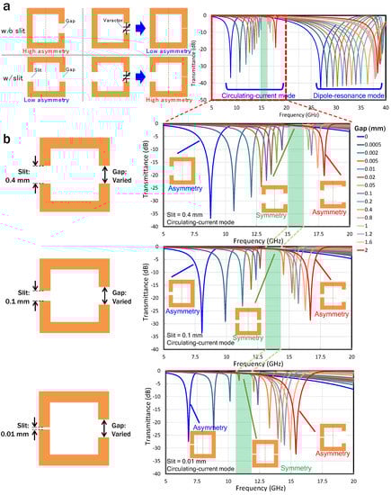 As described in the previous section, the use of varactors in the gap leads to a change in the asymmetry of the structure. To avoid the asymmetry reduction, an additional gap (or slit) was incorporated in the arm opposite the existing gap. The presence of the slit means that, even if a high-capacitance varactor is used within the gap, the asymmetry should remain at the level required for excitation of the circulating-current mode, as shown in Figure 3a. To confirm this behavior of the slit, the EM simulations were conducted. Figure 3b shows the dependence of the transmittance on the gap, for slits of 0.01, 0.1, and 0.4 mm. Similar to what was observed in the SRR without a slit, the intensity of the dipole-resonance mode for the SRRs with slits hardly depends on the size of the gap. However, in the circulating-current mode, the relationship between the gap and the peak intensity is different from that of the SRR without the slit. As the gap gradually decreases from 2 mm to a critical value defined by the constant size of the slit, the peak intensity becomes small. Furthermore, from said critical value to 0 mm, the peak gradually increases again. The region where the peak intensity reaches its minimum (green-highlighted areas in Figure 3) shifts to a lower frequency as the slit becomes smaller. These extremal regions coincide with the regions where the sizes of the gaps are close to that of the slit, thus the circulating-current path has a symmetric structure. The most important feature is that the circulating-current mode is excited even when the gap is small (when the capacitance value is large), unlike in the SRRs without a slit. This indicates that the transmission characteristics of the SRRs can be dynamically controlled by using the circulating-current mode once the SRRs are loaded with semiconductor-based variable capacitance devices.