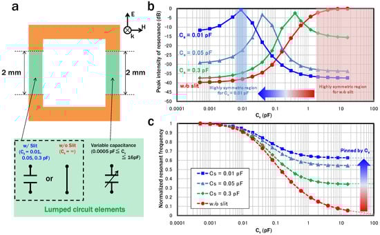 Next, considering the use of varactors as a form of variable capacitance at the gaps, EM simulations using lumped circuit elements were performed. A schematic diagram of the dimensions of the “slit SRRs” and their simulation conditions is shown in Figure 4a. A lumped capacitive element representing a variable capacitance (Cv) was connected to a 2 mm gap in the SRR. The capacitance of the 2 mm slit was also determined by a lumped capacitor (Cs) of 0.01, 0.05, or 0.3 pF. For comparison, SRRs in which the slit was short-circuited were also simulated. Figure 4b,c summarize the dependence of the peak intensity and resonance frequencies of the circulating-current mode on Cv for each value of Cs used. Figure 4c plots the resonance frequencies normalized by the maximum resonance frequency for each Cs condition for ease of comparison. Similar to the case where the SRRs were physically changed, the peak intensity decreases as Cv approaches Cs, indicating that the discussion regarding the asymmetry of the circulating-current path also applies to the electrical structural changes. As the discrete semiconductor-based variable capacitor operating in the microwave band has a capacitance of a few hundred fF to several pF, the circulating-current mode tends to be excited as Cs gets smaller (meaning the slit gets larger). However, a large Cs induces minimum-resonance-frequency pinning, as shown in Figure 4c. The circulating-current-mode frequency of the SRRs is . In the case of using a variable capacitor Cv, the resonance frequency, fr, becomes the following: