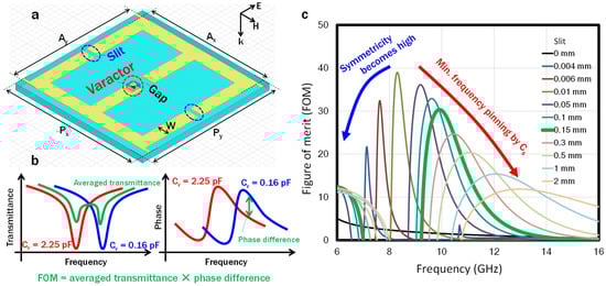 To determine the effectiveness of the slit, we designed and fabricated slit-SRRs that incorporated commercially available discrete varactors with a tuning range from 0.16 to 2.25 pF, for the voltage, Vapp, variation from 20 to 0 V. A schematic diagram of the SRRs is shown in Figure 5a, where Ax, Ay, Px, Py, and W are 5, 5, 5.5, 5.5, and 0.5 mm, respectively. A structure in which two C-shaped SRRs share the gaps was used to cancel out the magnetic responses of the two circulating currents with opposite directions. The slits were introduced to the outer arms that sandwich the center arm with the gap. To determine the size of the slit, the phase controllability and the transmission loss associated with single-layer metamaterial were quantified by a figure of merit (FOM) defined by multiplying the averaged transmittance and difference in the transmission phase for minimum and maximum capacitances of 0.16 and 2.25 pF, respectively (Figure 5b). Figure 5c shows the dependence of the FOM on the slit size, in which the tradeoff described in the previous section can be observed. The decrease in the peak value of the FOM in the low-frequency region is due to the electrical asymmetric structure changing to a more symmetrical one. The decrease in the high-frequency region is due to the minimum-frequency pinning by Cs. In addition, the bandwidth becomes wider as the slit becomes smaller. In this study, the slit was designed to be 0.15 mm after considering the FOM and the process limitations of the metal patterning.