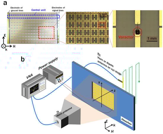 Figure 6b is a schematic diagram of the experimental setup. The fabricated slit-SRR array was evaluated with the setup composed of an Agilent N5247A vector network analyzer (VNA), DC power supply or signal generator for applying a voltage to the varactors, and an xyz linear motor stage to perform two-dimensional (2D) scans. Two double-ridged horn antennas were used as the transmitter (Tx) and as the receiver (Rx) in transmittance and transmission phase measurements. Moreover, a dipole antenna made from a coaxial cable was used as the Rx antenna in the 2D field distribution measurements. During the measurements of the transmission characteristics, the measured intensity and phase were normalized by the data without the sample. In the 2D field measurement, the Tx antenna and the sample were placed at a certain constant distance apart, while the dipole antenna was automatically controlled by an electronic motor in order to measure the fields continuously. RF absorbers were also placed to prevent reflections between the instrumentation. The electric-field polarization of the wave was set to be parallel to the gap of the SRRs.