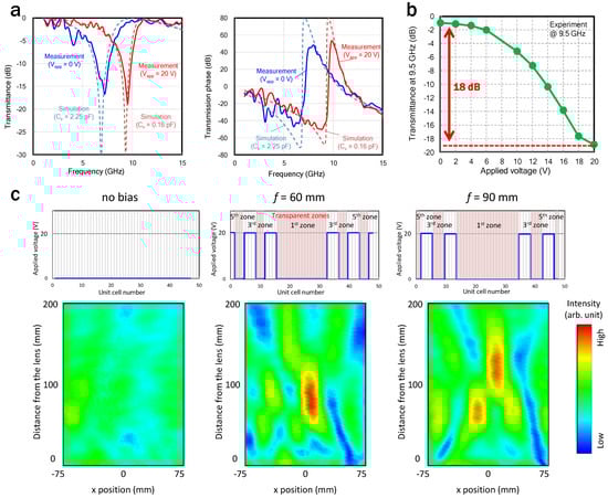 A dependence of transmittance on the applied voltage at 9.5 GHz is shown in Figure 7b. A change in applied voltage from 0 to 20 V induces a shift in the resonance frequency, resulting in a change in intensity of 18 dB at 9.5 GHz. A response speed measured using a rectangular signal wave revealed a high-speed operation of approximately 20 MHz while maintaining the change in the intensity of transmitted waves, which is fast enough for the beam control in mobile communication systems. Figure 7c shows the measured electric-field distributions versus the applied voltage profiles. At the operation frequency of 9.5 GHz, the region with an applied voltage of 0 V corresponds to the transparent odd-numbered zones and that with the voltage of 20 V corresponds to the opaque even-numbered ones. The applied voltage is distributed so that the focal length becomes 60 and 90 mm according to Equation (3). For comparison, the field distribution when the whole area becomes transparent with an applied voltage of 0 V is also shown in Figure 7c. Compared with the case where all of the zones become transparent, the electric-field concentration can be confirmed in the case of applying a voltage based on the FZP theory. In addition, it was experimentally verified that the focal length was changed by varying the applied voltage distributions. The difference between the designed focal length and the measured value is mainly due to the fact that the incident wave is not an ideal plane wave and the aperture size of the lens is finite. When the aperture size becomes sufficiently large, that is, when the number of zones is sufficiently large, the focal point according to Equation (3) becomes the point where the electrical field is the highest. However, when the number of zones is small, the point where the electric field is the highest moves farther from the designed one.