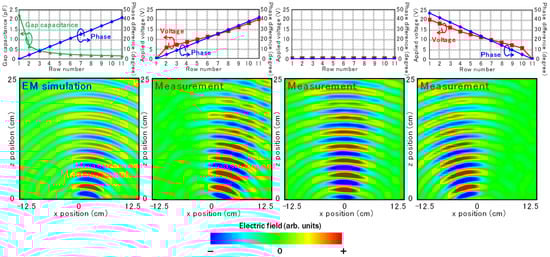 Simulated and measured electric-field distributions and Cv and Vapp profile in the array. In the simulation and measurement of the distribution, three fabricated samples were stacked with air spaces of around 5 mm in the propagation direction of the incident waves.