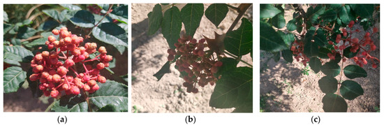 This study takes the fruit of the Zanthoxylum tree in a modern Zanthoxylum garden as the research object. As shown in Figure 1, the original images were collected from the Industrial Park of Maiji District, Tianshui City, Gansu Province; and the Zanthoxylum Park of Jishi Mountain, Dongxiang County, Gansu Province, respectively. Pepper trees in the garden row were spaced approximately 3 meters apart, plant spacing was approximately 1.8 meters, and the tree height was approximately 2 meters, which was suitable for the pepper-picking robot to work in the garden. The Zanthoxylum varieties were Dahongpao and Mianjiao. All the JPEG images are collected by Nikon 40D camera, and all the image resolutions are 6000 × 4000 pixels. A total of 4000 prickly pepper fruit images were collected.
